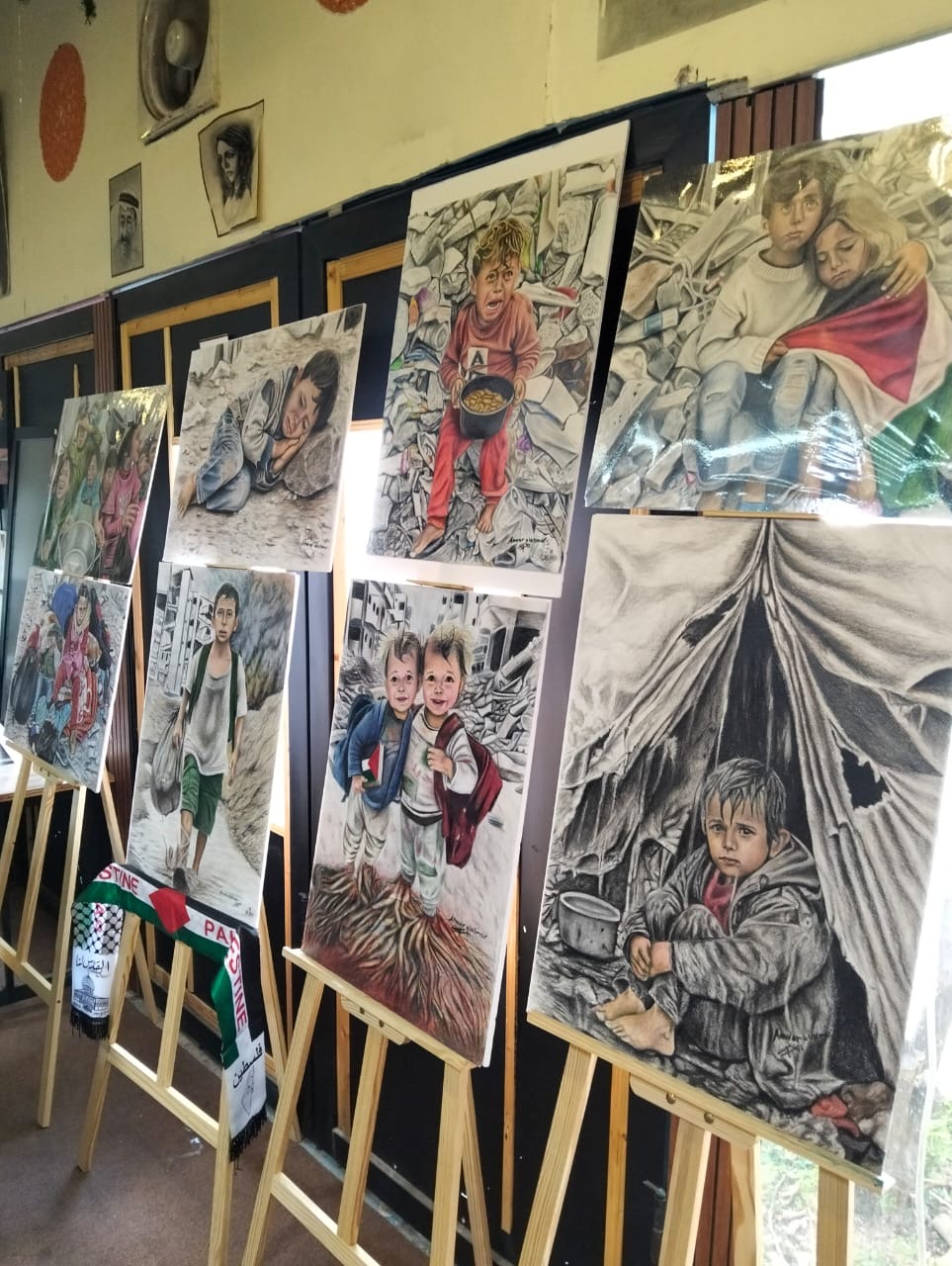 وقد ركز الفنانون المشاركون في لوحاتهم على مأساة الأشقاء في غزة وخاصة الأطفال والقضية الفلسطينية، وكذلك عكسوا صورة الأردن المشرق وطبيعته الخلابة إضافة لبعض البورتيرهات والخيل العربي الأصيل والطبيعة الخلابة وفصل الربيع في محافظة إربد..