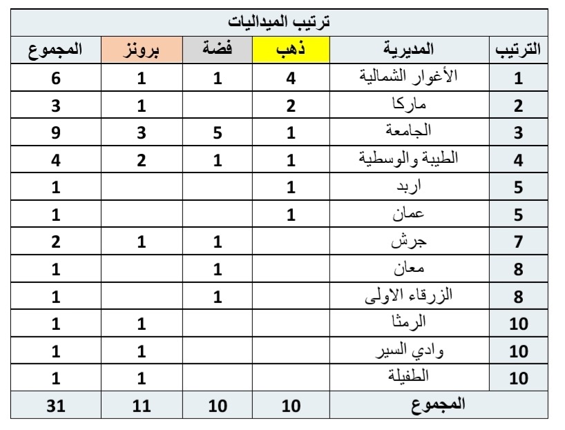 وعلى صعيد ألعاب القوى، واصلت الأغوار الشمالية تألقها بتحقيق المركز الأول في سباق التتابع 4×50 متر، إضافة إلى تصدرها منافسات الوثب الطويل، ما عزز موقعها في صدارة الترتيب العام، تلتها مديرية الجامعة في المركز الثاني، ثم الطيبة والوسطية في المركز الثالث.