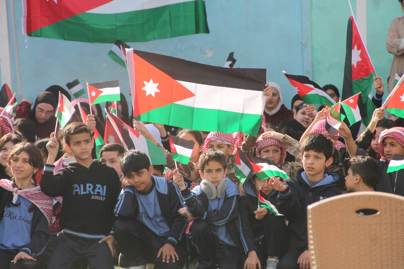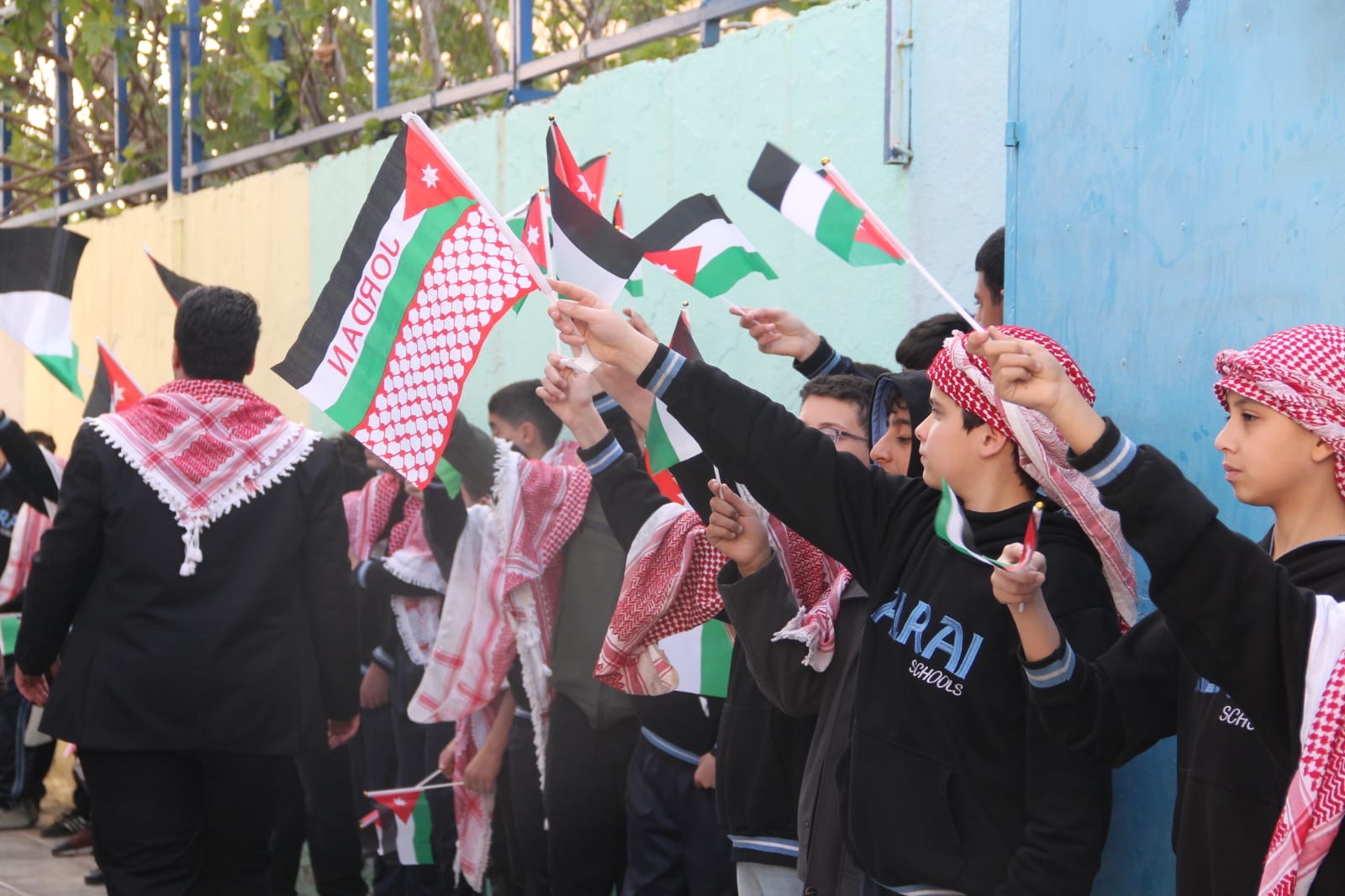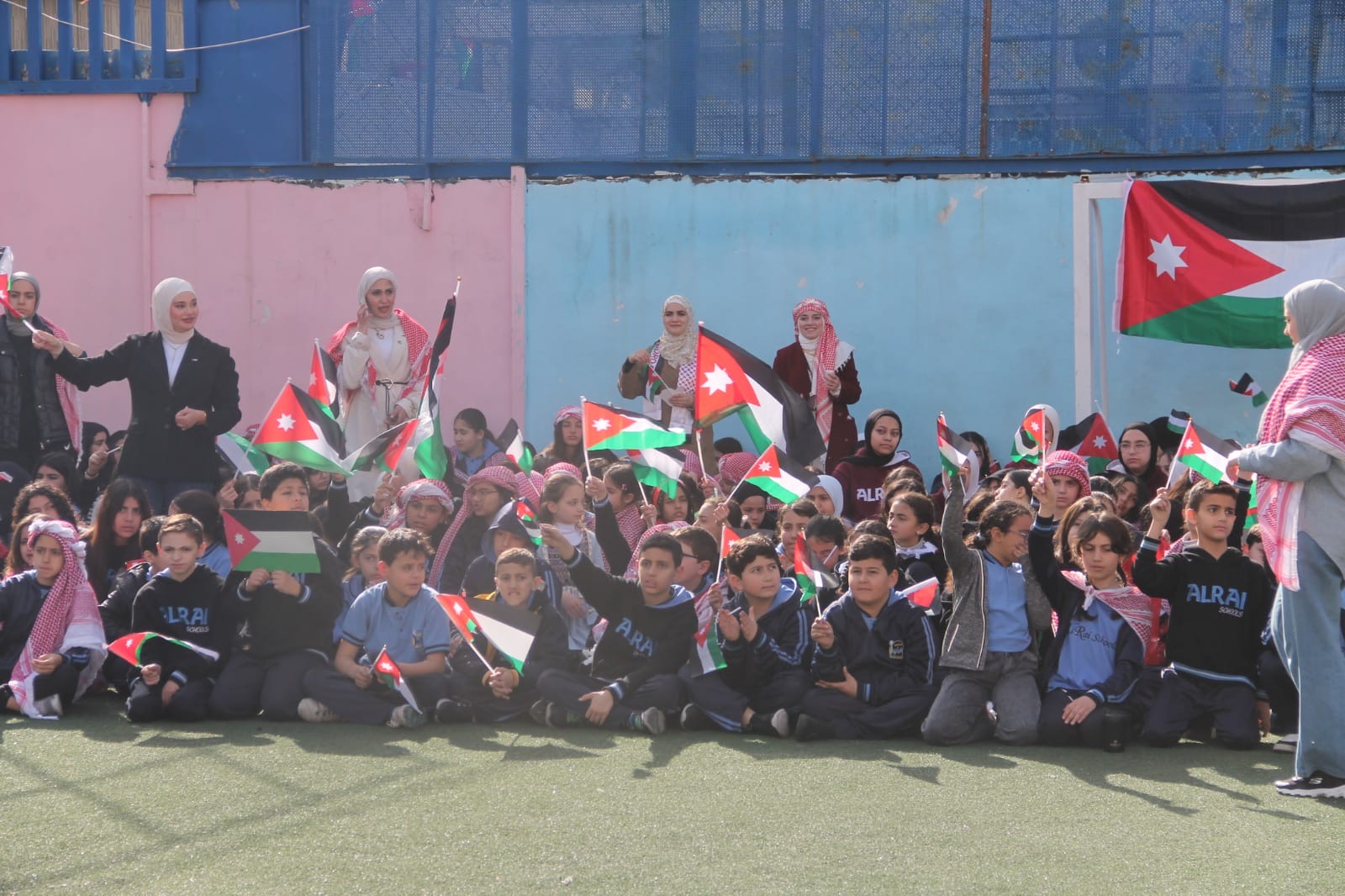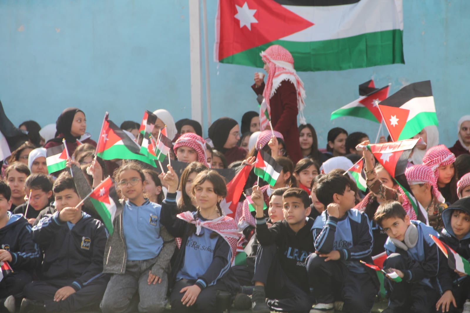 عمان جو- نظمت مدارس الرأي اليوم احتفالا بمناسبة يوم العلم في ملعب المدرسة في عمان.