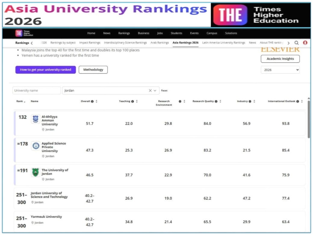 عمان الأهلية الأولى أردنياً و 132 قاريّاّ بتصنيف التايمز لجامعات آسيا 2026