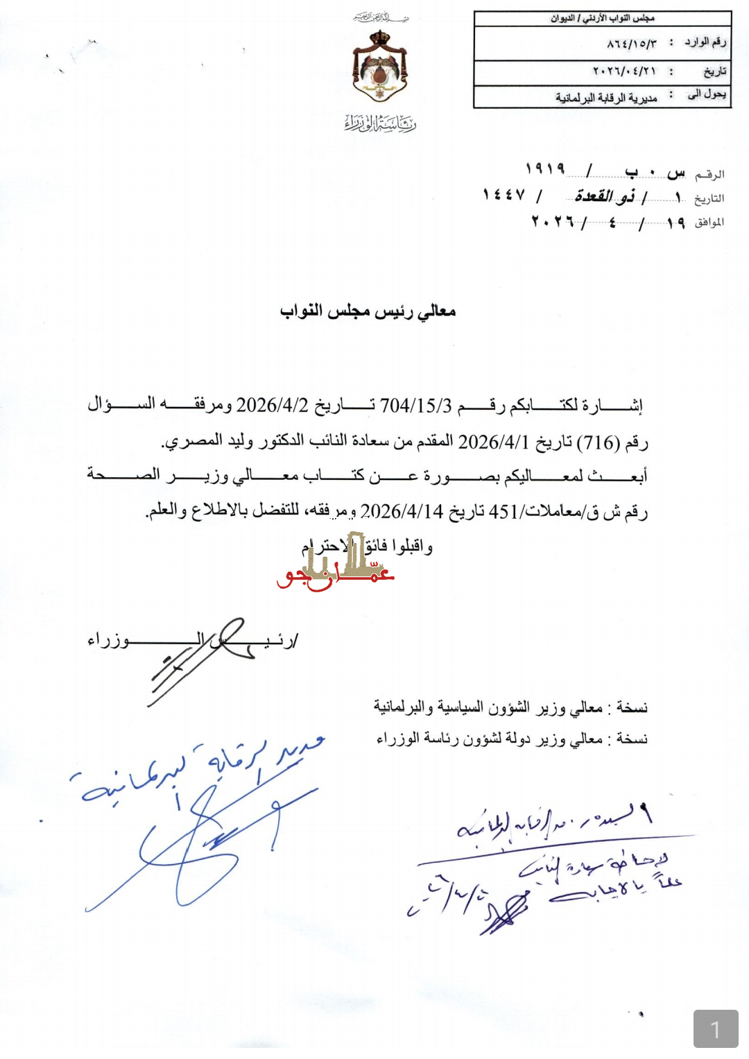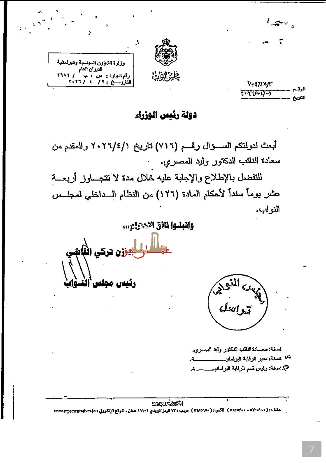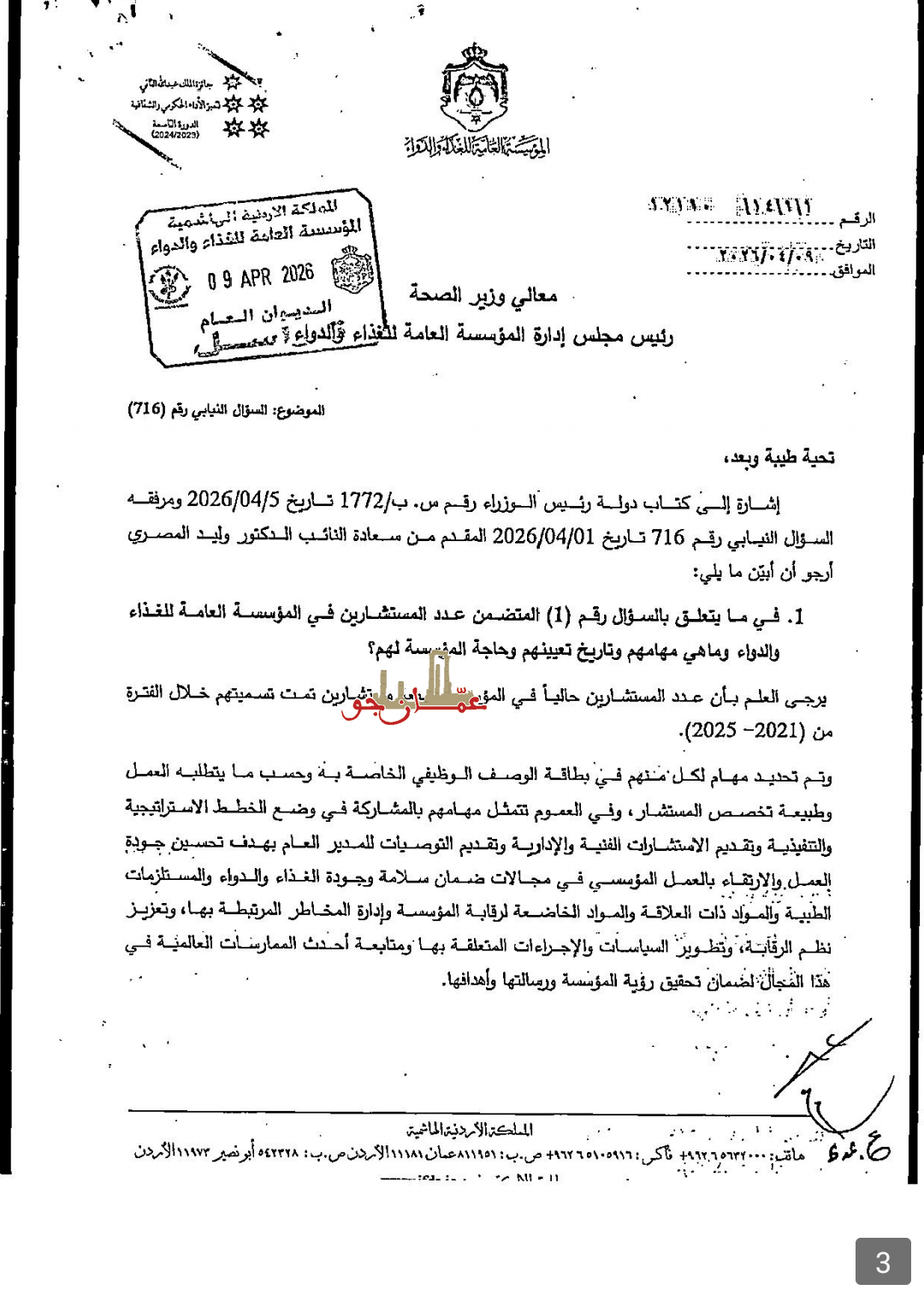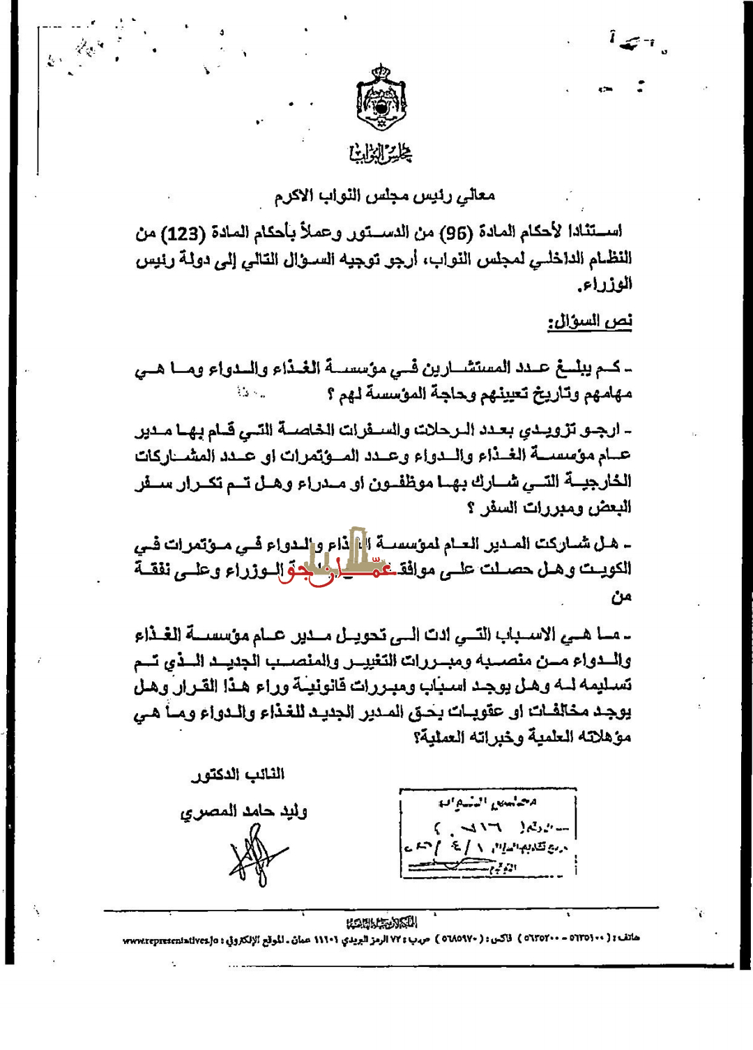 ردت المؤسسة العامة للغذاء والدواء على استفسارات نيابية وجهها النائب وليد المصري إلى الحكومة حول عدد المستشارين في المؤسسة ومهامهم وحاجة المؤسسة لهم بالإضافة إلى عدد الرحلات والسفرات الخاصة التي قام بها مدير عام مؤمسة الغذاء والدواء وعدد المؤتمرات او عدد المشاركات الخارجية التي شارك بها موظفون او مدراء وهل تم تكرار سفر البعض ومبررات السفر.