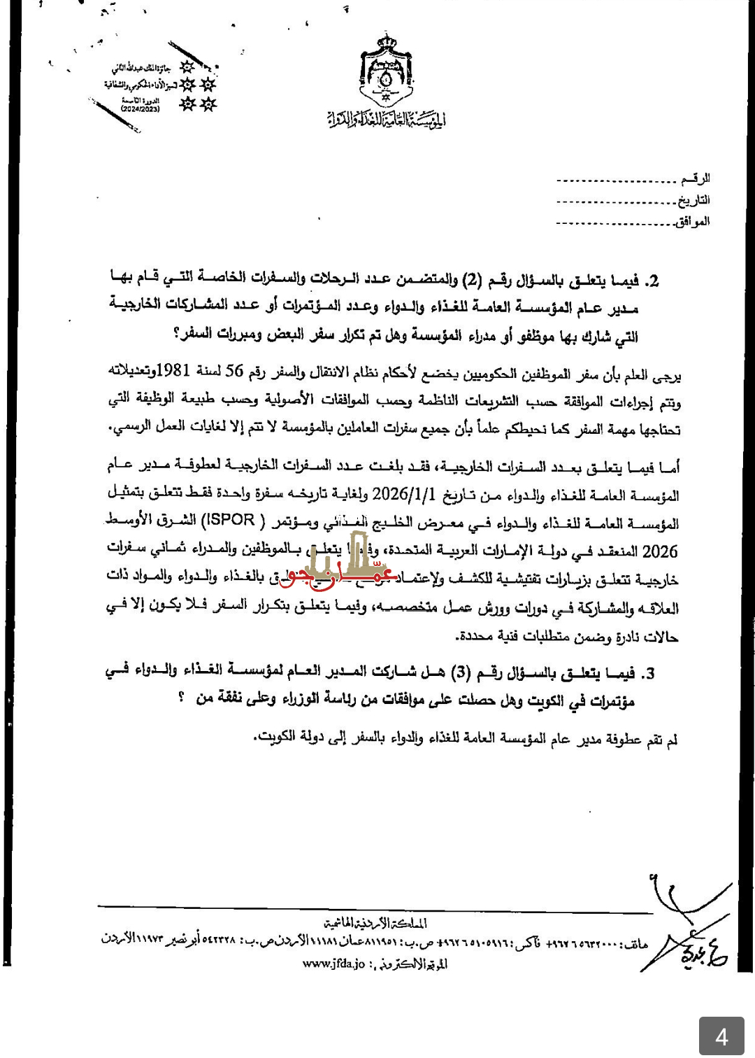 وحول عدد الرحلات والسفرات الخاصة التي قام بها مدير عام المؤسسة العامة للغذاء والدواء وعدد المؤتمرات أو عدد المشاركات الخارجية التي شارك بها موظفو أو مدراء المؤسسة وهل تم تكرار سفر البعض ومبررات السفر؟، أكدت المؤسسة أن السفرات الخارجية لمدير عام المؤسسة من تاريخ 2026/1/1 ولغاية تاريخه سفرة واحدة فقط تتعلق بتمثيل المؤمسة العامة للغذاء والدواء في معرض الخليج الغذائي ومؤتمر (ISPOR) الشرق الأوسط 2026 المنعقد في دولة الإمارات العربية المتحدة، وفيما يتعلق بالموظفين والمدراء ثماني سفرات خارجية تتعلق بزيارات تفتيشية للكشف ولاعتماد مواقع تصنيع تتعلق بالغذاء والدواء والمواد ذات العلاقه والمشاركة في دورات وورش عمل متخصصه، وفيما يتعلق بتكرار السفر فلا يكون إلا في حالات نادرة وضمن متطلبات فنية محددة.