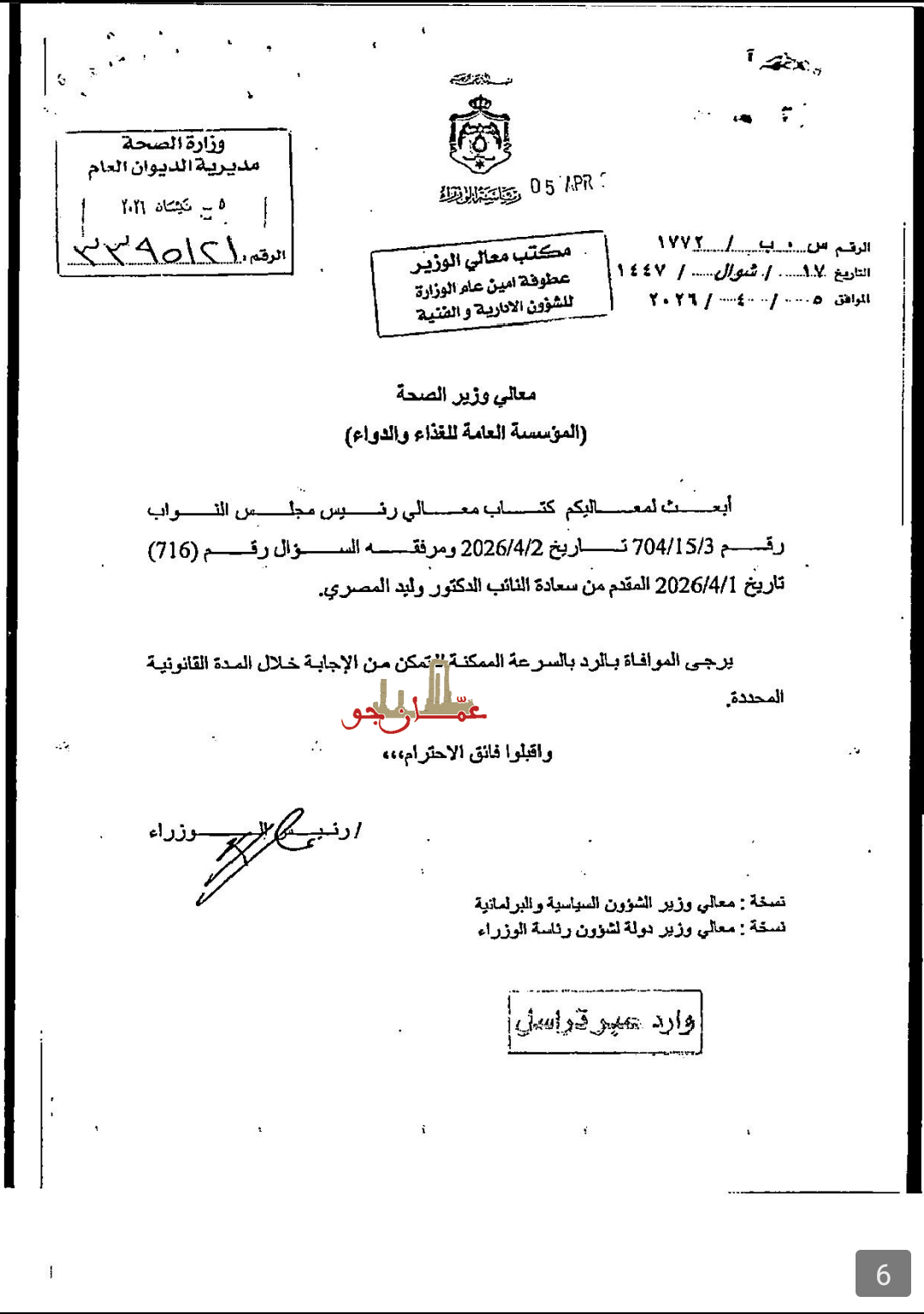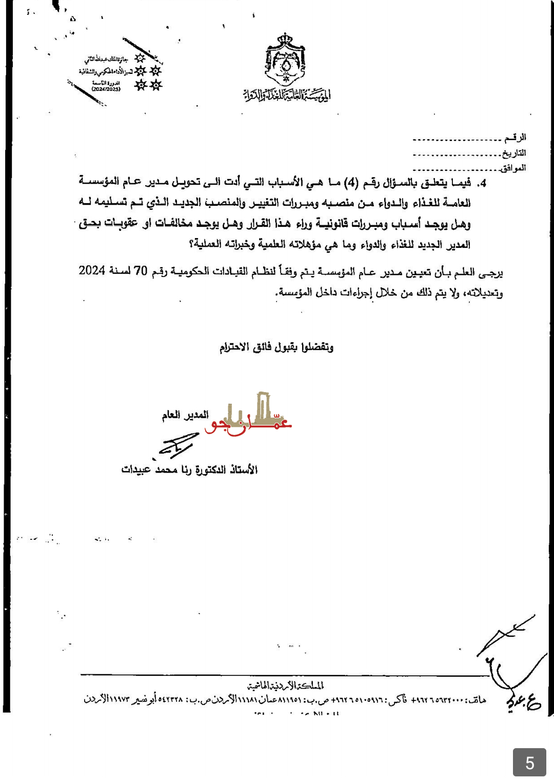وحول الأسباب التي أدت الى تحويل مدير عام المؤسسا العامة للغذاء والدواء من منصبه ومبررات التغيير والمنصب الجديد الذي تم تسليمه له وهل يوجد أسباب ومبررات قانونية وراء هذا القرار وهل يوجد مخالفات او عقوبات بحق المدير الجديد للغذاء والدواء وما هي مؤهلاته العلمية وخبراته العملية، أجابت المؤسسة أن تعيين مدير عام المؤسسة يتم وفقاً لنظام القبادات الحكومية رقم 70 لسنة 2024 وتعديلاته، ولا يتم ذلك من خلال إجراءات داخل المؤسسة.