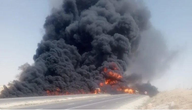 وكان الطريق الصحراوي قد شهد، يوم الإثنين، حادثا مروعا تمثل في اشتعال النيران بثلاثة صهاريج محملة بالمشتقات النفطية في المنطقة الواقعة قبيل "سواقة" بمحافظة الكرك.