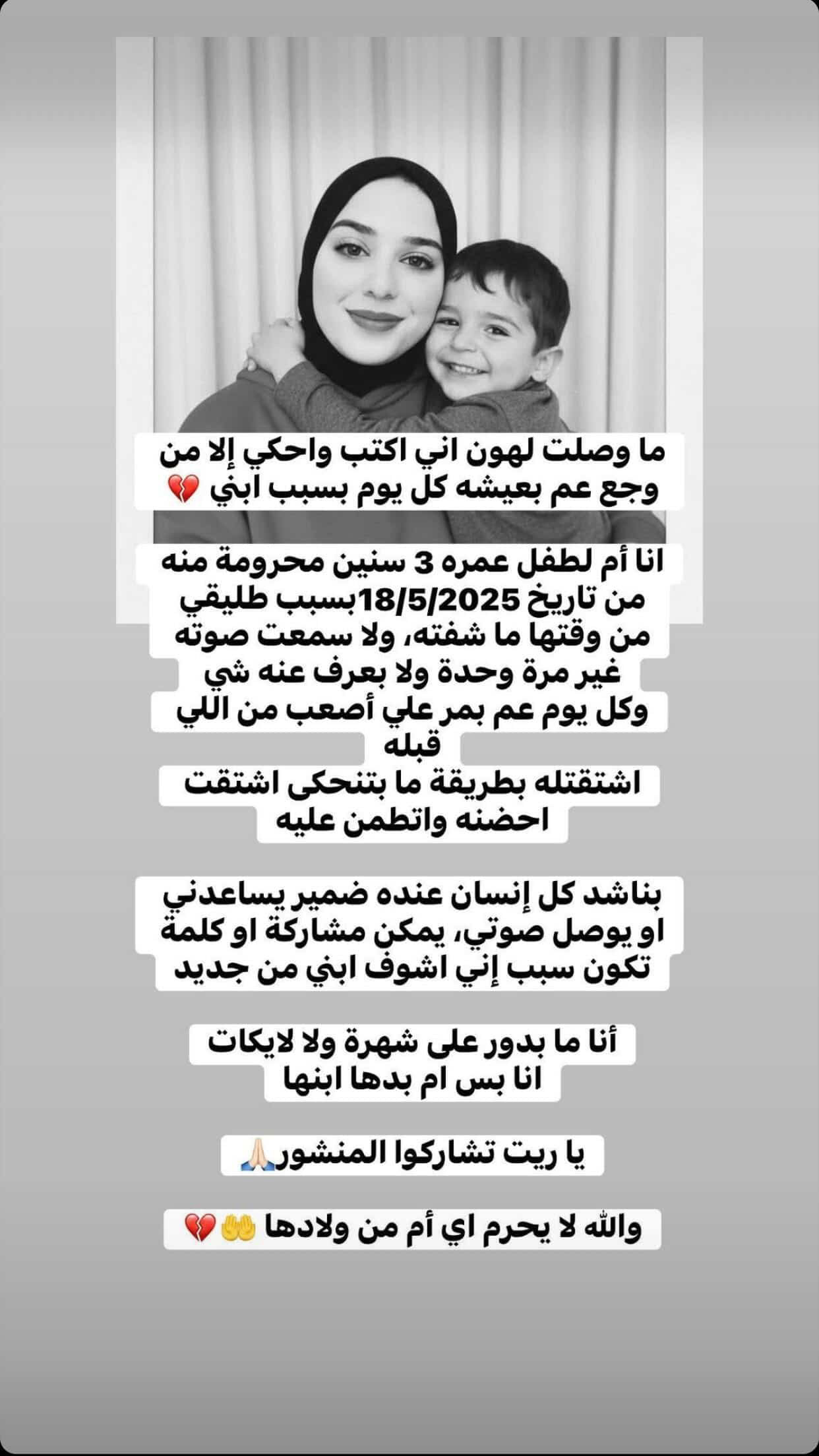ما وصلت لهون اني اكتب واحكي إلا من وجع عم بعيشه كل يوم بسبب ابني انا أم لطفل عمره 3 سنين محرومة منه من تاريخ 18/5/2025 بسبب طليقي من وقتها ما شفته، ولا سمعت صوته غير مرة وحدة ولا بعرف عنه شي وكل يوم عم بمر علي أصعب من اللي اشتقتله بطريقة ما بتنحكى اشتقت
