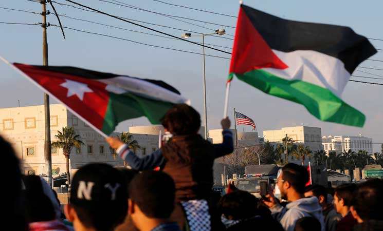 وتجمع مئات آخرون قرب سفارة واشنطن في عمان منددين بقرار ترامب ومطالبين بإغلاق السفارة وطرد السفير اضافة الى الغاء معاهدة السلام الموقعة مع اسرائيل عام 1994.