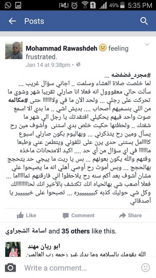 ونشر أصدقاؤه آخر ما كتبه المرحوم الرواشدة على موقع التواصل الاجتماعي فيسبوك