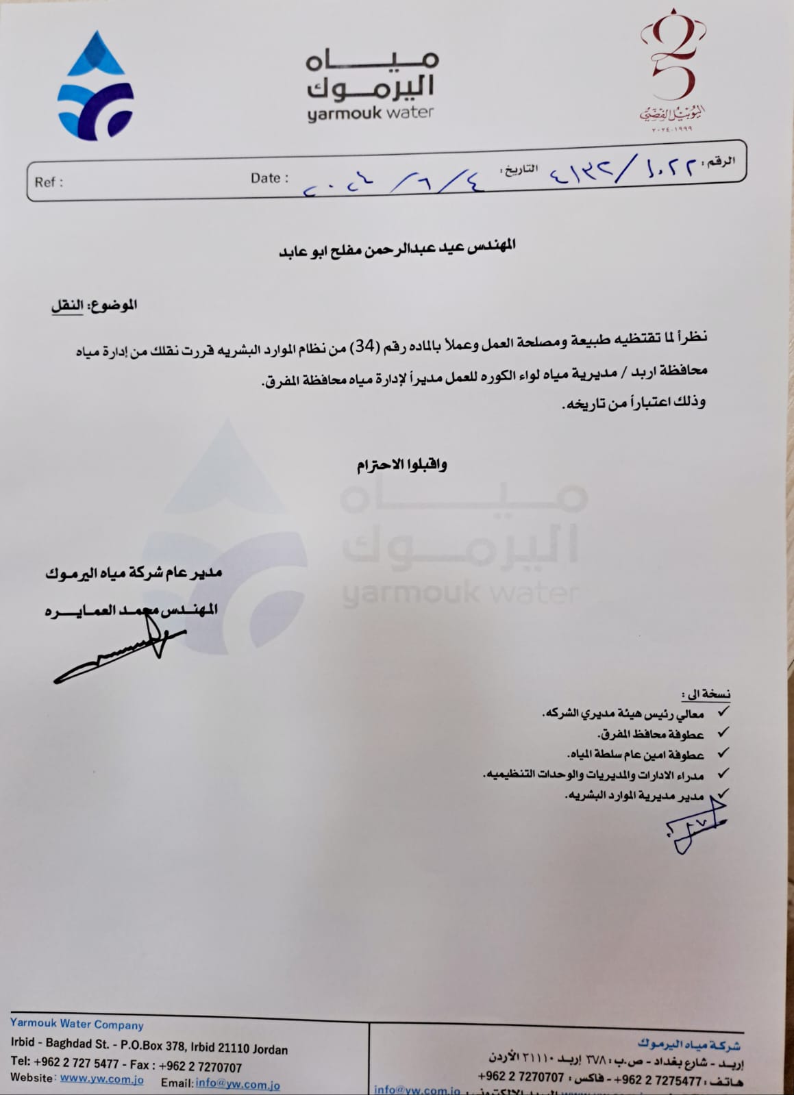 مياه اليرموك تعين مديرا جديدا لادارة مياه محافظة المفرق