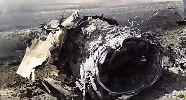 وبحسب فيديو نشرته اعماق تظهر بقايا الطائرة متناثرة في صحراء بعضها ما يزال يحترق.